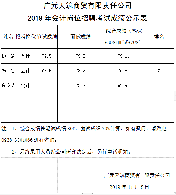廣元天筑商貿(mào)有限責(zé)任公司2019年會(huì)計(jì)崗位招聘考試成績(jī)公示表