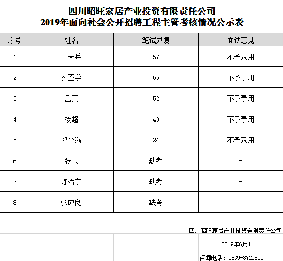 四川昭旺家居產(chǎn)業(yè)投資有限責(zé)任公司2019年面向社會(huì)公開(kāi)招聘工程主管考核情況公示表