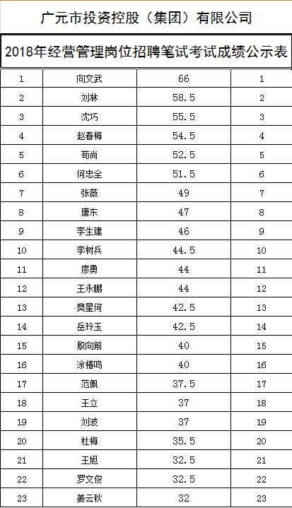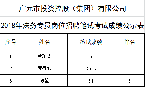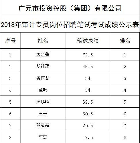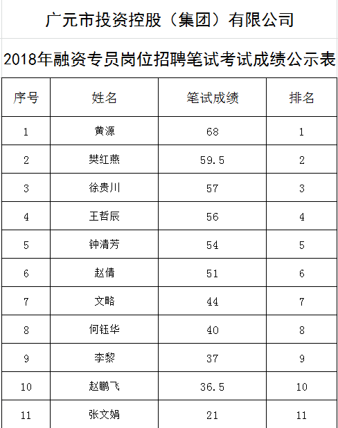 廣元市投資控股(集團(tuán))有限公司2018年公開招聘工作人員筆試成績公示